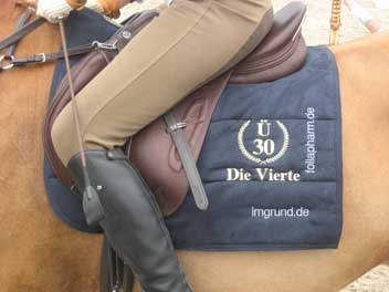 Er trug maßgeblich dazu bei, dass der sportliche Part des Lehrgangs von allen Reitern mit einem zufriedenen und oft auch stolzen Lächeln beendet wurde. Frei nach dem Motto "Niederrheinischer Regen fällt immer daneben" zeigte sich zwischenzeitlich sogar kurz die Sonne, was den Fotos der teils auch mitgereisten Hobbyfotografen neben den abgelichteten sportlichen Leistungen der "erwachseneren" Buschreiter ebenfalls zu Gute kam. Dieses Jahr konnte das Organisationteam wieder eine Vielzahl von Sponsoren gewinnen, die es ermöglichten, dass jedem Teilnehmer eine "Ü-30: Die Vierte" Schabracke überreicht werden konnte, die z.T. auch direkt vor Ort eingeweiht wurde. Daneben wurden Leckerlies für die Vierbeiner und Gutscheine vom www.CrossCountryShop.de verteilt. Ein herzliches Dankeschön an die "Ü-30" Sponsoren: - www.imgrund.de - www.engenhorst-gmbh.de - www.hulingshof.de - www.bissels.eu - www.foliapharm.de - www.reitplatzpflege.de Für Verpflegung war an beiden Tagen reichlich gesorgt. Neben Frühstück und Mittagessen im Stübchen der Reitanlage fand sich am Samstagabend noch einmal eine Vielzahl der Teilnehmer zum gemeinsamen Kochen zusammen. Auch diese außerreiterlichen Aktivitäten führen zu einer lockeren ungezwungenen Atmosphäre, die diesen Lehrgang bereits in seiner vierten Auflage zu etwas Besonderen macht. Viele der Reiter nehmen schon zum wiederholten Male teil und lassen sich auch von einer weiten Anreise nicht abschrecken, so dass es hoffentlich auch im nächsten Jahr heißt: Klappe "Ü-30: Die Fünfte"! [Quelle: Viola Rose, Aktivensprecherin RV Seydlitz-Kamp] |