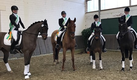 Am Pfingstsonntag stellten sich unsere Nachwuchsreiter, Junioren, Junge Reiter und Reiter dem "Standartenkampf". Im Wettkampf um den Kreisjugendwimpel 2017 siegte überzeugend die Mannschaft gastgebenden Vereins St. Hubertus Wesel- Obrighoven. Carla Buchmann (Duplex), Hilde Kötter (Mister Minit), Kira Stegemann (Philine) und Eileen Neu (Lord of Lindenhof) nahmen den Wimpel mit nach Hause. In der Einzelwertung um den Kreismeistertitel in dieser Prüfung setzte sich Carina Koch vom RV Seydlitz Kamp nach allen drei Teildisziplinen (Dressur, Springen, Gelände)an die Spitze und holte sich verdient den Kreismeistertitel "Kreis- meister Vielseitigkeit Ponies". Bei den Junioren setzte sich, wie im vergangnen Jahr, die Mannschaft des RV Seydlitz Kamp an die Spitze. Unschlagbar unterwegs waren: Lina Gesa Völke (Pluspunkt), Amy Ingensand (Fee-Belle)und Amelie Colsmann (Madjarin den Tip). In der Einzelwertung konnte sich Charlotte Fritzen vom RFV Jagdfalke Brünen nach überzeugenden Leistungen in allen drei Teildisziplinen den Meisterschaftstitel "Kreismeister Vielseitigkeit Junioren" sichern. Bei den Jungen Reitern/Reitern sicherte sich das Team vvom gastgebenden Verein die Kreisstandarte. Clara Sophie Abeck (Don Edosto), Elisa Abeck (Cambion), Kristin Maiwald (Cadeau Noir) und Nadja Schulte (Ringwoody WSO) stellten ihr Können unter Beweis und wurden mit dem ersten Platz belohnt. Den Titel des "Kreismeisters Reiter" konnte Caro Hoffrichter (Lucky v/h Trappersveld) vom RV Seydlitz Kamp überzeugend erlangen. Gesamtsiegerin der Prüfng wurde Elisa Abeck (Ernst L)vom gastgebenden Verein und wurde so Kreismeisterin in der Vielseitigkeit der Jungen Reiter.