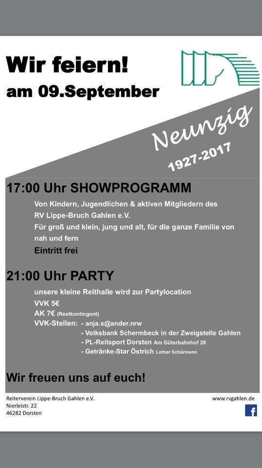 Jahreshauptversammlung am Mittwoch, den 29. März 2017 in der Niederrheinhalle Wesel ab 20:00 Uhr statt! Herr Karl-Heinz Schümers, Inhaber der bekannten Eis-Kiste, wird auch dieses Jahr wieder ein Hindernis für Ihren Parcours verlosen! Viel Glück! www.eiskiste.de Die Einladung mit den aktuellen Tagesordnungspunkten gibt es hier zum Downloaden: Einladung: |