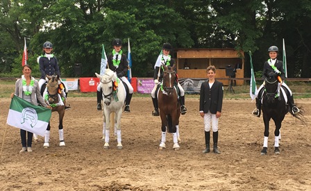 Ein erfolgreiches und bis zum Schluss spannendes Wochenende geht für das Team Rheinland bei der Goldenen Schärpe der Ponyreiter in Überherrn/Saarland auf der Anlage der Familie von Boch zu Ende. 18 Mannschaften aus dem gesamten Bundesgebiet ritten um die begehrte goldene Schärpe der Vielseitigkeitsreiter. Zum Team des Rheinlandes gehörten auch 4 Reiterinnen und Reiter des Kreisverbandes Wesel. Es starteten unter der Leitung von Landestrainerin Christina Hoffmann Carla Buchmann (RV Obrighoven) mit Duplex, Julias Herz (RV Nümbrecht) mit Caspar, Carina Koch (RV Seydlitz Kamp) mit Zyprianus, Myna Schäpers (RV Obrighoven) mit Irish Rose und Oliver Mario Senf (RV Lippe Bruch Gahlen) mit Steverheides Dondrup.