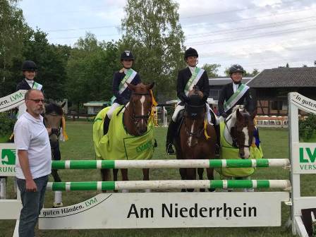 [v.l.n.r.: Kreismeister/innen Springen: Domenico Giorgi, Melissa Hoffmann, Peter Rieskamp (LVM), Vivian Sanders] Bei den Ponyspringreitern siegte Charlotte Fritzen vom gastgebenden Verein vor Hannah te Heesen (RuFV Hünxe) und Eve Olschowka vom RSv St. Hubertus Wesel-Obrighoven.