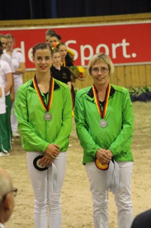 [ Silbermedaillen-Gewinnerinnen: Fabienne Nitkowski und Iris Schulten] Der Höhepunkt folgte zum Abschluss der Saison. Fabienne Nitkowski, Einzel-Voltigiererin der VRG In den Auen, gewann bei den deutschen Jugendmeisterschaften in Aachen in der U 18-Klasse die Silbermedaille. „Mit diesem Ergebnis haben wir überhaupt nicht gerechnet“, sagte Trainerin und Longenführerin Iris Schulten. Mit ihrem Pferd Dantéz legte die 15-Jährige besonders in den Kürprüfungen beeindruckende Vorstellungen hin.