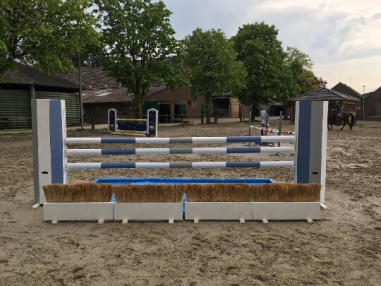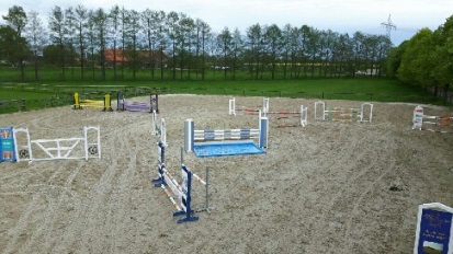 Springprüfungen der Klasse "S" müssen ab sofort einen Wassergraben im Parcours vorweisen. Der Kreis-Pferdesportverband Wesel hat einen "Mobilen Wassergraben" angeschafft, Veranstalter von Springprüfungen der Klasse "S" können diese gegen einen Kostenbeitrag in Höhe von 100,00 Euro für ihre Veranstaltung ausleihen. und 2 weiße Fahnen Aktuell ist der "Mobile Wassergraben" auf der Anlage von Stefan Miss aufgebaut: